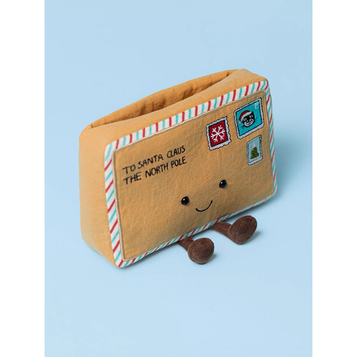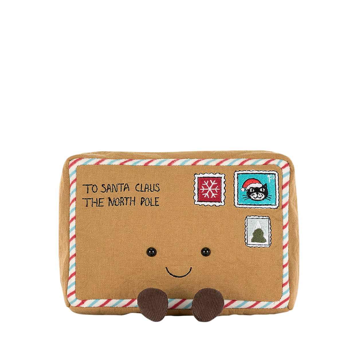 Send a special message this Christmas with Jellycat's Amuseables Letter to Santa. A textured brown envelope with candy cane striped edging is decorated with embroidered stamps and address, with a slot in the back for your letter and sealed with an embroidered Jellycat head.