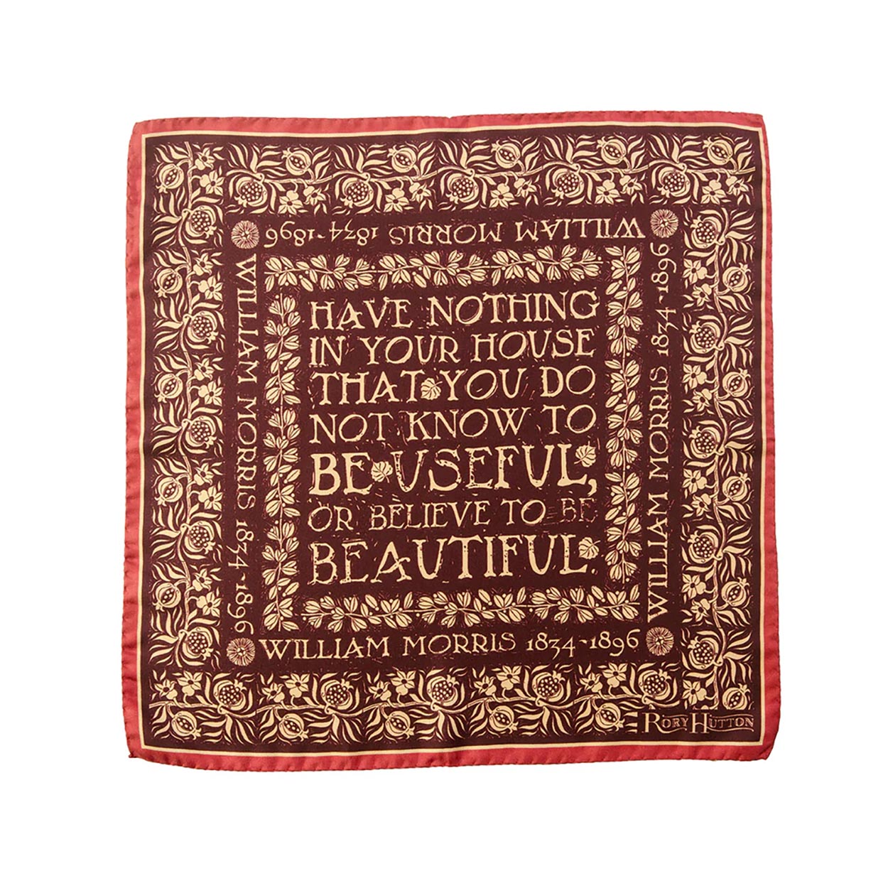 Enhance your outfit with this exquisite silk pocket square from Rory Hutton. Adorned with the immortal words of William Morris: "Have nothing in your house that you do not know to be useful or believe to be beautiful," this piece effortlessly combines fashion and functionality. Its borders feature charming motifs of pomegranates, mistletoe, and sunflowers, paying homage to the iconic Arts and Crafts Movement.