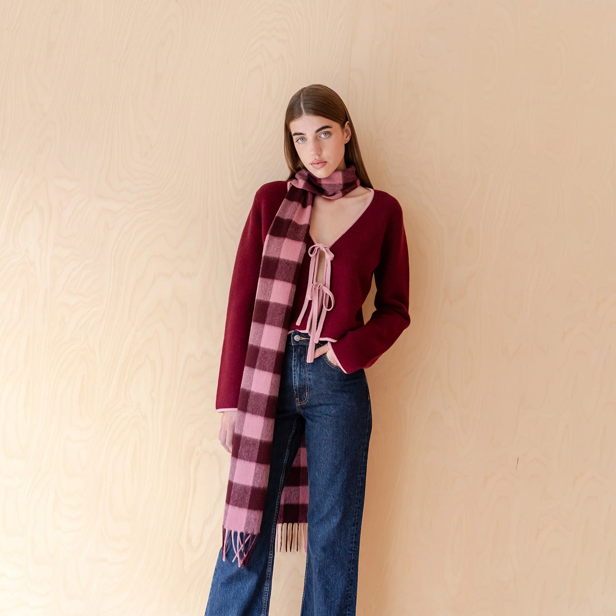 Elevate your outfit with this extra long TBCo skinny scarf in a classic berry burgundy and pink gingham check. It's woven from soft and thermo-regulating lambswool for optimised comfort and warmth. The perfect finishing touch.
