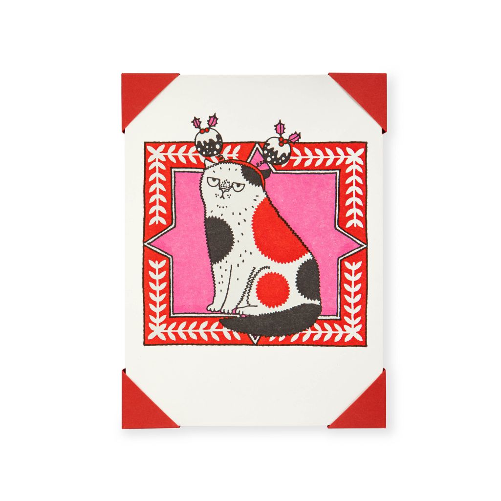 Vibrant, dynamic and a little bonkers, this grumpy festive cat, and yes they are Christmas puddings, is a perfect seasonal card to make anyone smile.