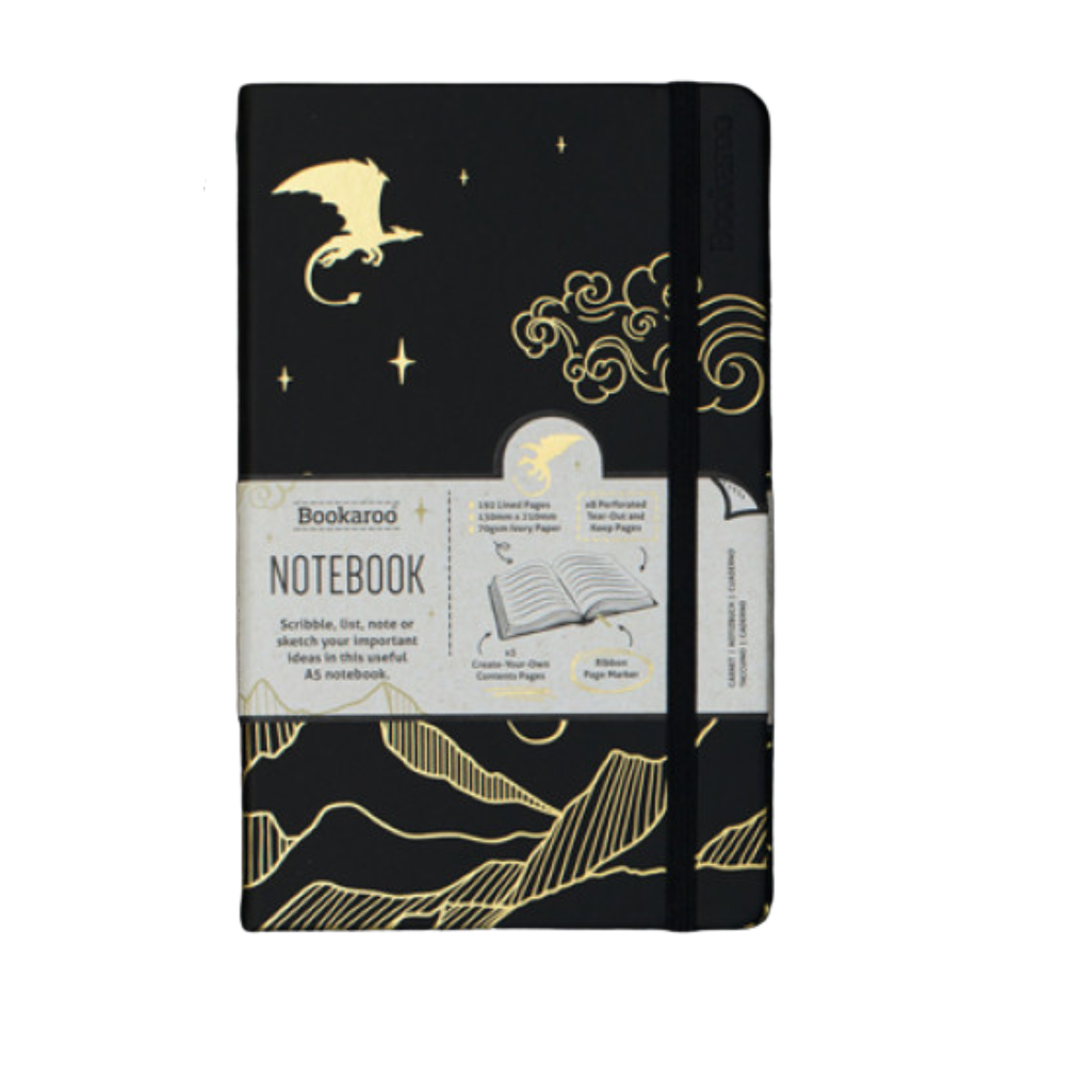 Record your thoughts and daydreams in this very striking black with gold foil dragon & mystical landscape A5 hardback journal.