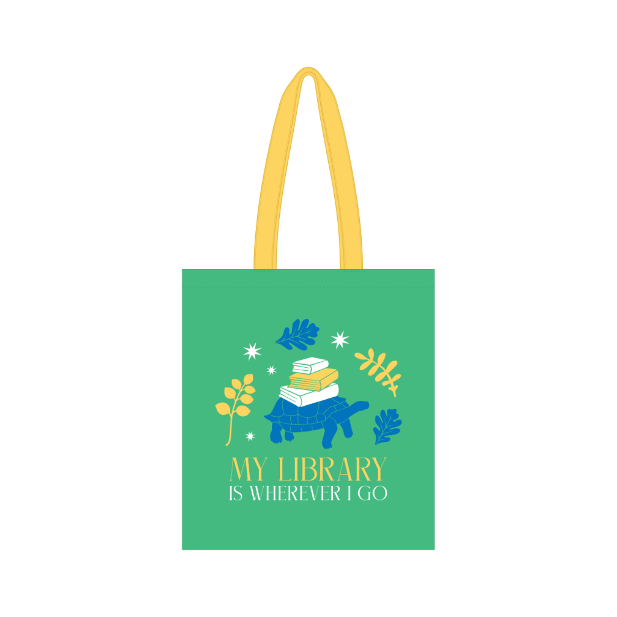 Featuring an illustration of a tortoise carrying a pile of books, with leaf and star details, and completed with the phrase 'My library is wherever I go'.