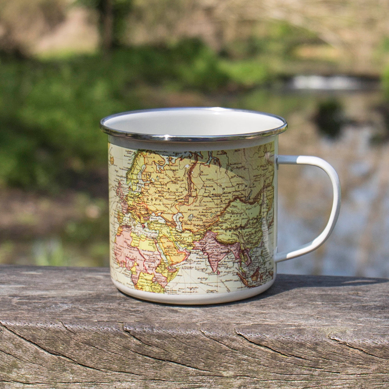 We are big fans of this enamel mug featuring an all over print of a classically coloured vintage world map.